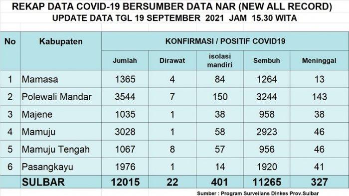 Data tersebut berdasarkan rilis Dinas Kesehata Provinsi Sulawesi Barat melalui Satuan Tugas (Satgas) penanganan Covid-19 Sulbar, Minggu (19/9/2021) malam.