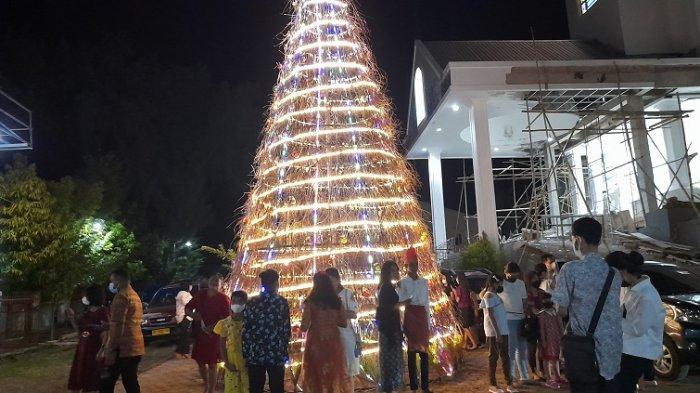 TRIBUN-SULBAR.COM, MAMUJU - Sebuah pohon Natal unik berdiri di depan Gereja Katolik Paroki Santa Maria Ratu Rosari di Jl Bau Massepe, Kabupaten Mamuju, Sulawesi Barat (Sulbar).