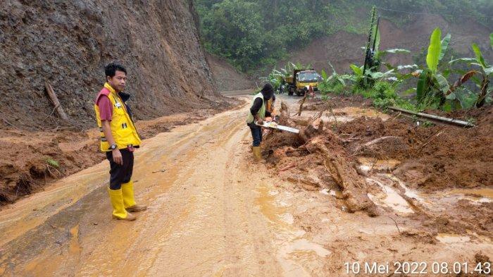 Hujan mengakibatkan tebing di sisi jalan longsor hingga material metutupi badna jalan.