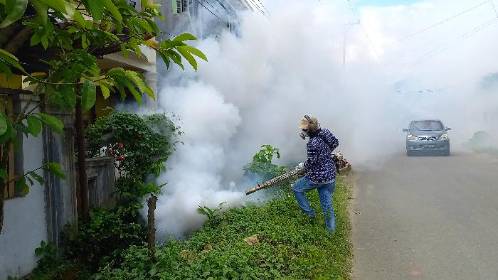 Untuk mengantisipasi penyebaran DBD, Dinkes melakukan penyemprotan foging di selokan warga.