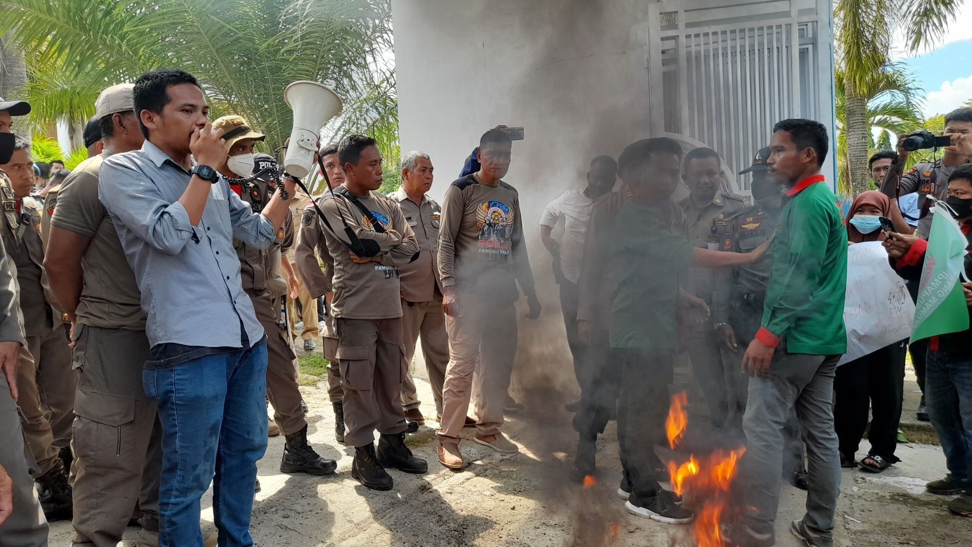 Sehingga, terjadi gesekan beberapa menit antara aparat Satpol PP dan puluhan massa aksi.