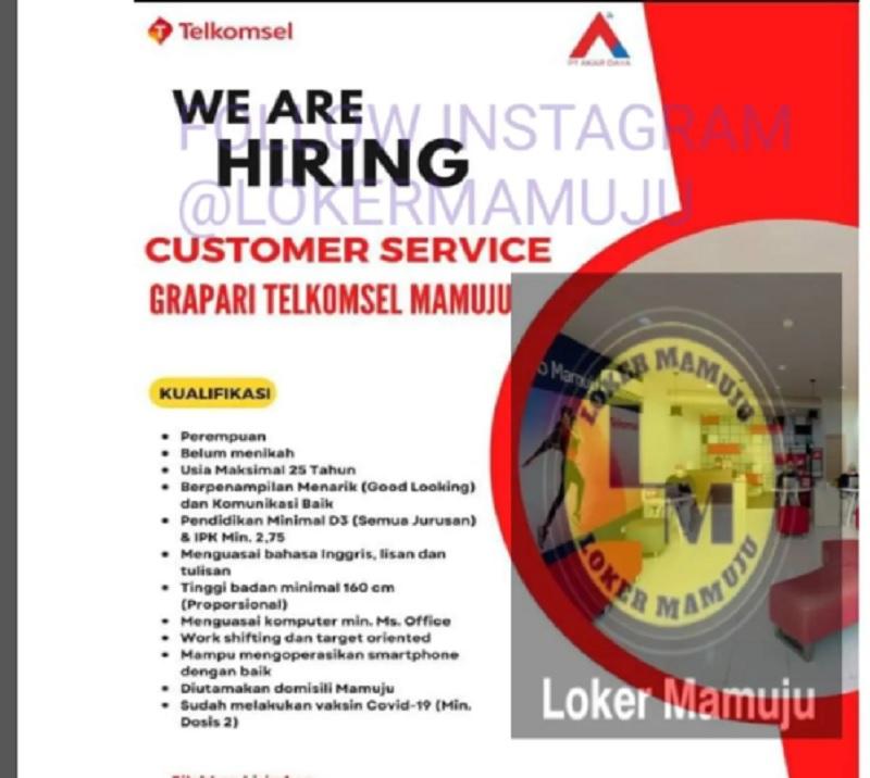 Grapari Telkomsel Mamuju sedang membuka lowongan kerja untuk posisi Costomer Service.