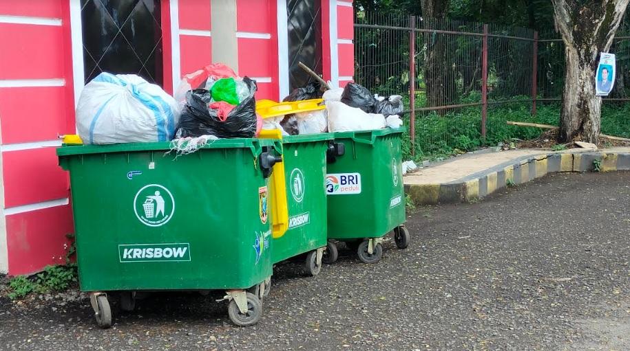 Penampungan sampah yang disediakan petugas kebersihan nampak sudah penuh, akibatnya sampah berserakan.