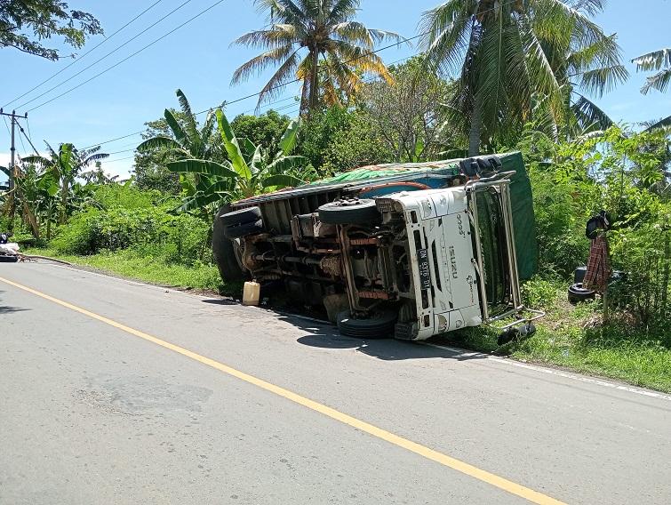Truk Izuzu terbalik di pinggir jalan poros Majene.