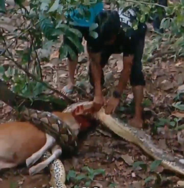Anak sapi itu tampak mengalami luka parah pada bagian kepala, begitupun dengan ular piton kepalanya terluka usai ditebas.