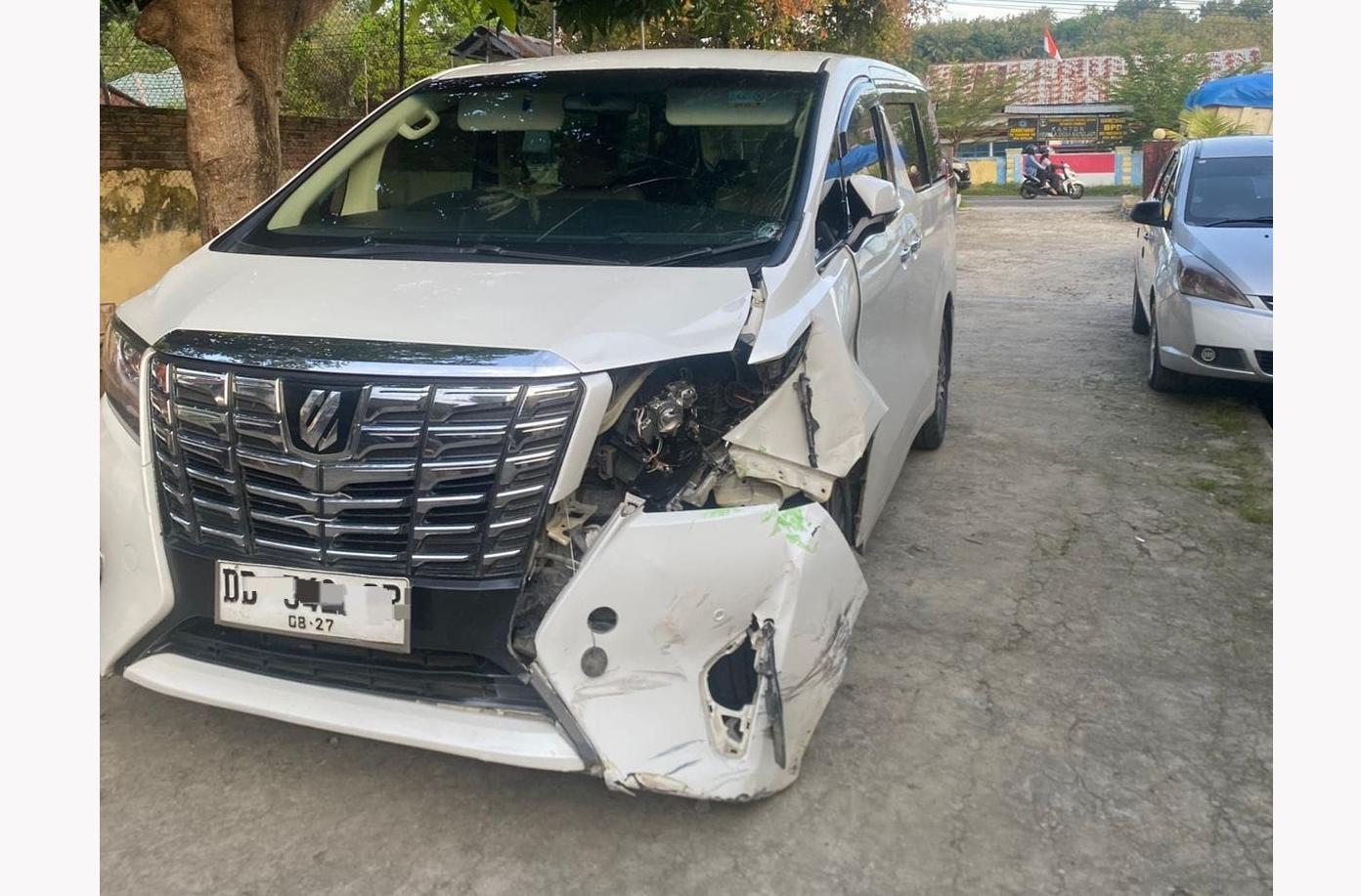Kecelakaan melibatkan mobil Toyota Alphard berwarna putih dengan nomor polisi DD 342 QR.