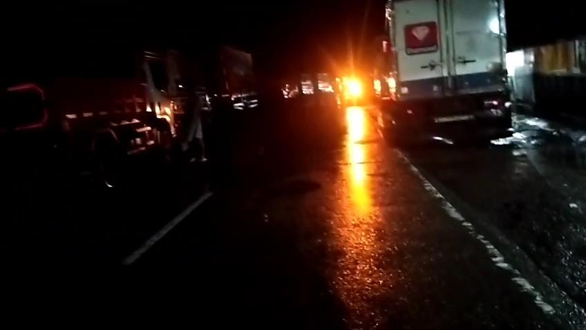 Kondisi itu mengakibatkan antrean panjang truk-truk dan kendaraan lainnya mengular.