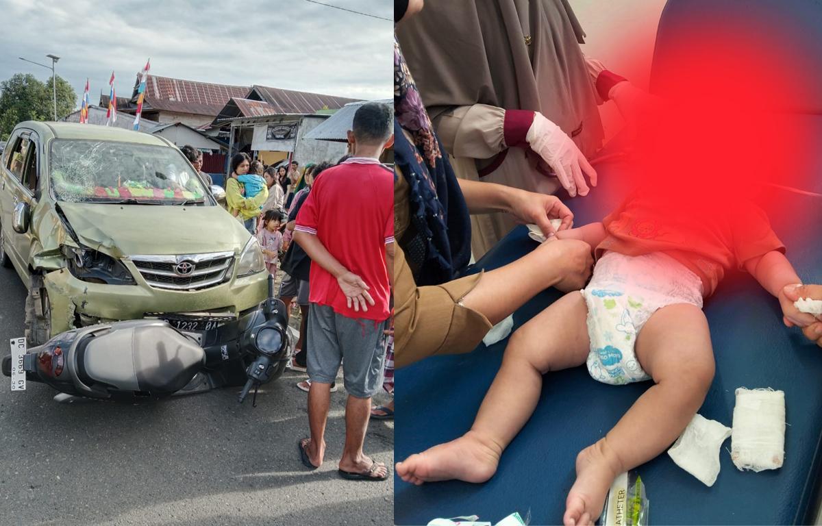 Akibat benturan keras, bayi Adlan (3 bulan) diduga terlempar dari gendongan dan mengalami luka serius.