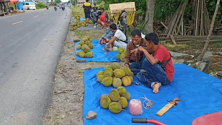 Puluhan penjual buah durian di Desa Botto Kecamatan Campalagian, Kabupaten Polman melapak di pinggir jalan trans Sulawesi.