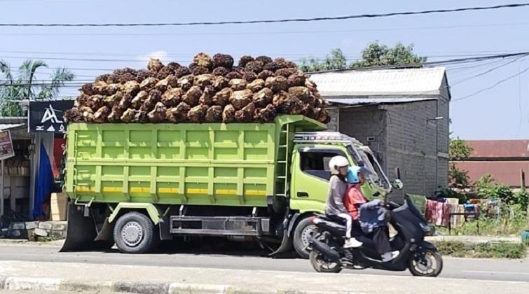 Rerata truk pemuat sawit memaksimalkan angkutannya di atas tinggi bak muatan dan tidak menggunakan penutup atau jaring.