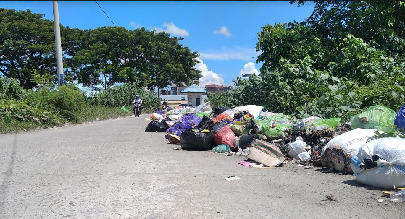 Tumpukan sampah ini nampak terlihat di jalan masuk terminal baru Wonomulyo. Setidaknya tiga titik sampah menumpuk di sepanjang jalan ini.