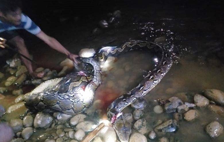 Kejadian ini pada Kamis (2/1/2025), kemarin, tubuh sapi itu masih utuh di dalam perut ular piton yang memangsanya.